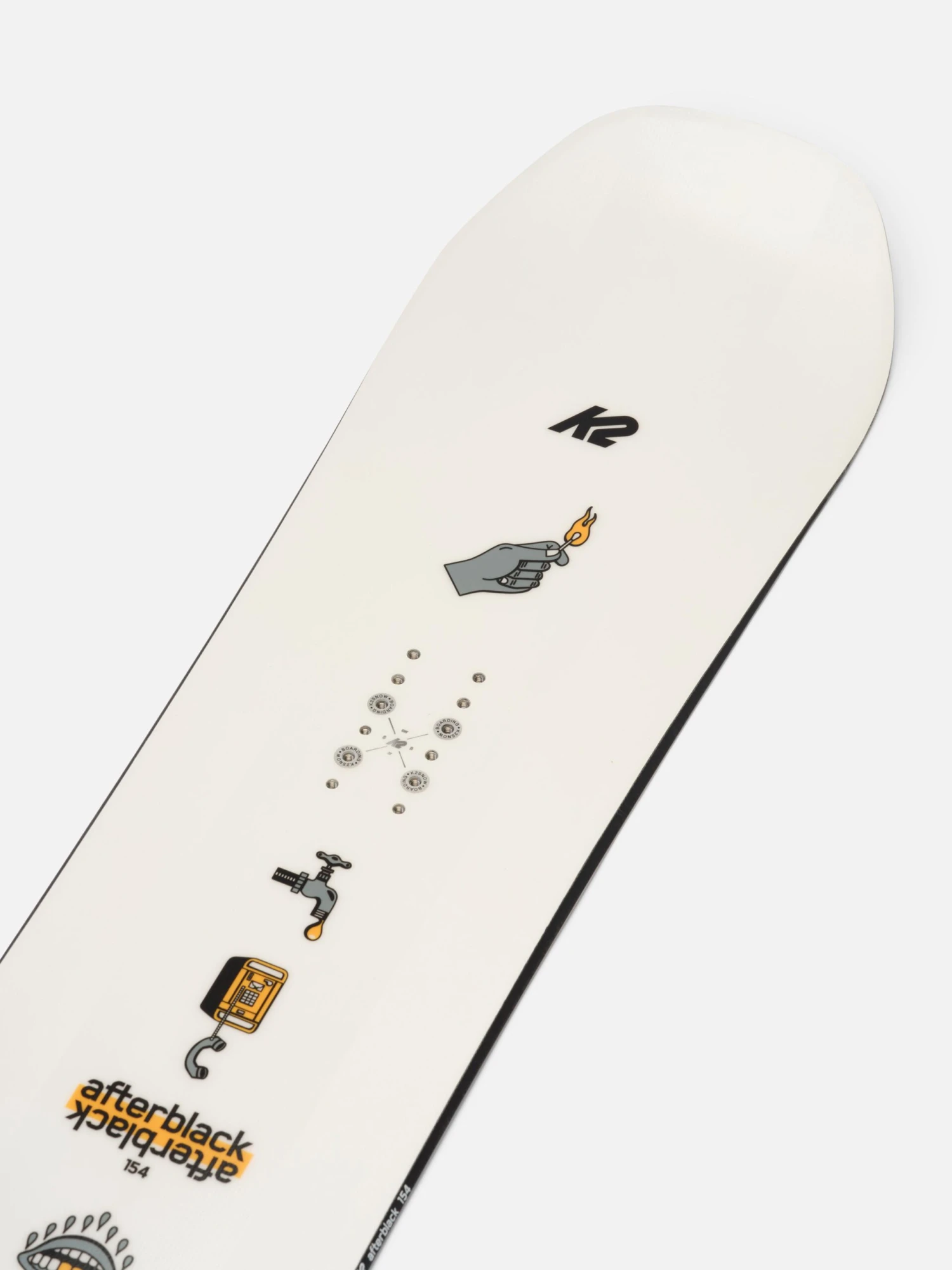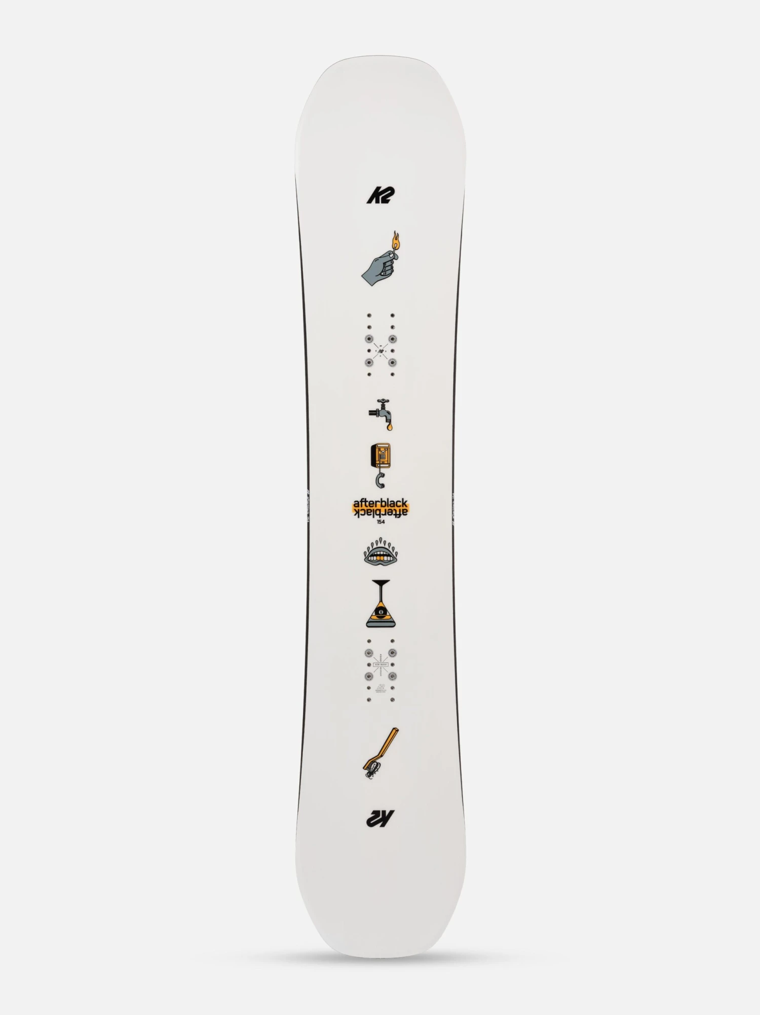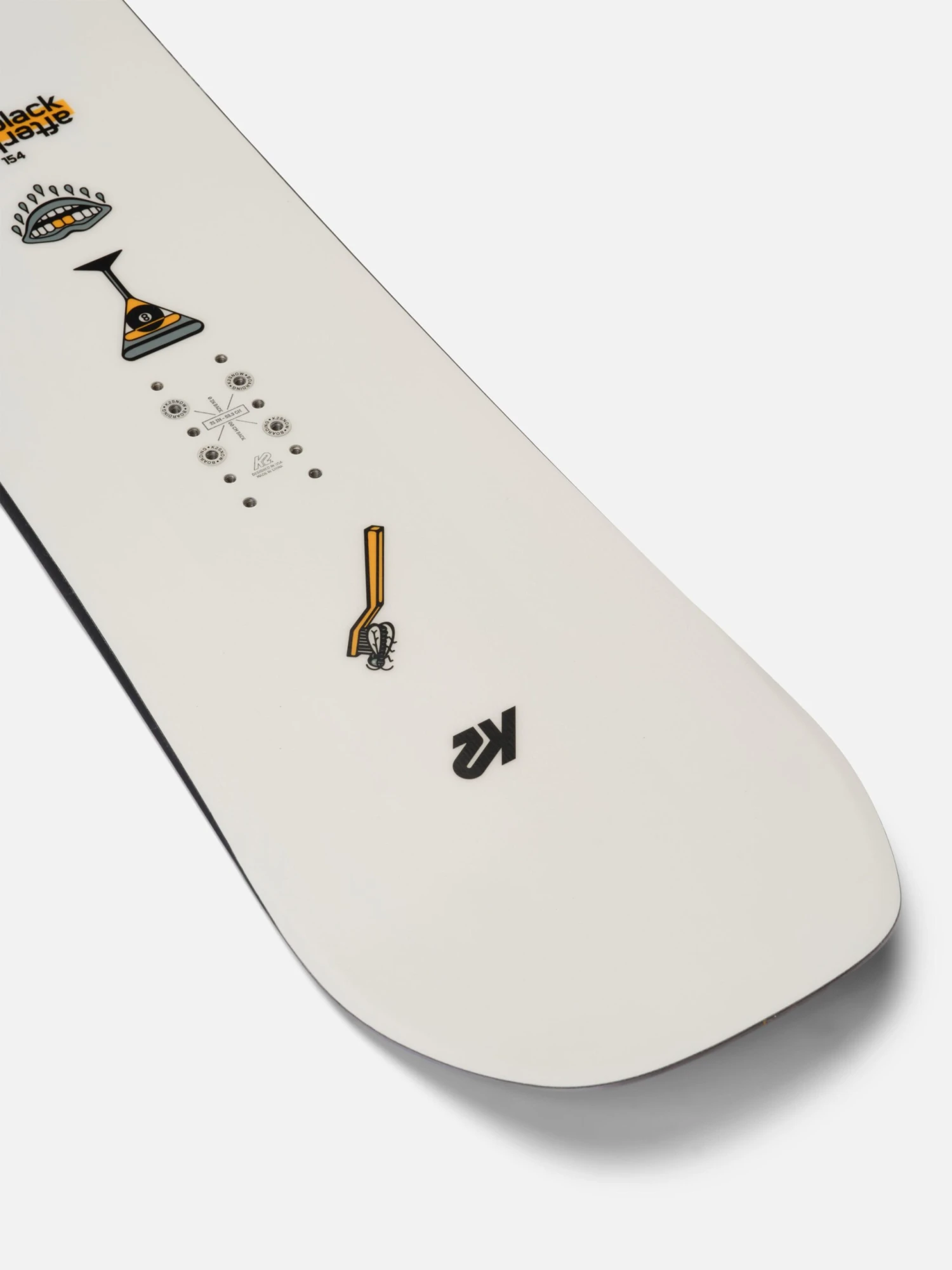 We’ve taken a proven construction and design philosophy and listened to our team riders to bring together the all-new K2 Afterblack twin tip snowboard. Team riders Mark Wilson and Justin Phipps weighed in heavy on tip & tail shape, sidecut radius, blend zone, and camber profile. After rounds of testing on the hill and in the streets, we signed the dotted line on the second incarnation of the K2 Afterblack.